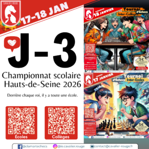 Le week-end du 25 janvier 2025 se déroulera le championnat des Hauts-de-Seine des écoles et collèges. La manifestation se déroulera à Clamart dans la salle des fêtes Jules Hunebelle, 1 Place Jules Hunebelle, 92140 Clamart Vous pouvez trouver tous les détails de la manifestation (horaires, document pour diffusion, …) sur les pages spéciales du tournoi …